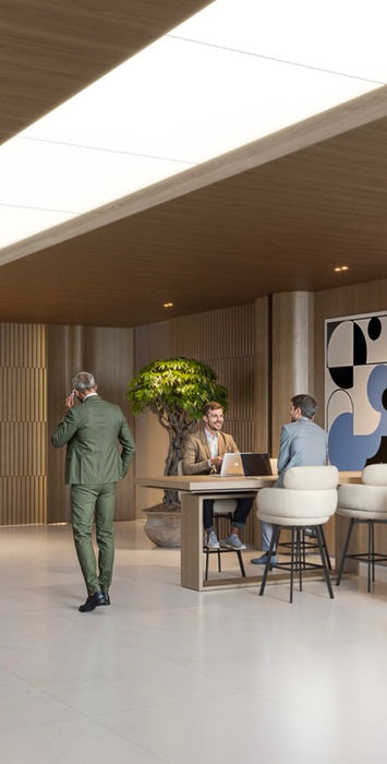 The spacious bright lobby with a cozy soft lounge area and 24/7 concierge service welcomes residents and their guests, offering a sense of comfort and serenity.